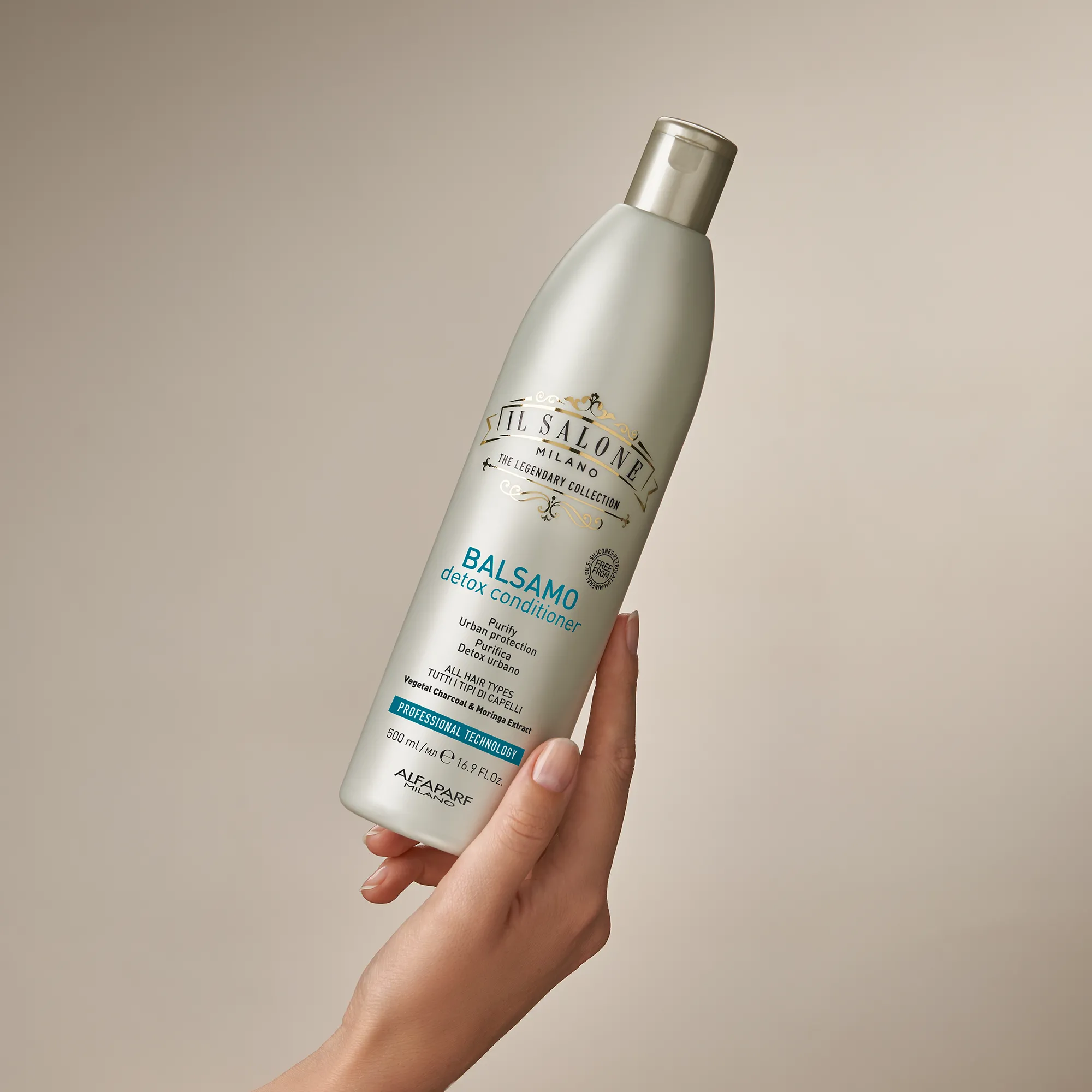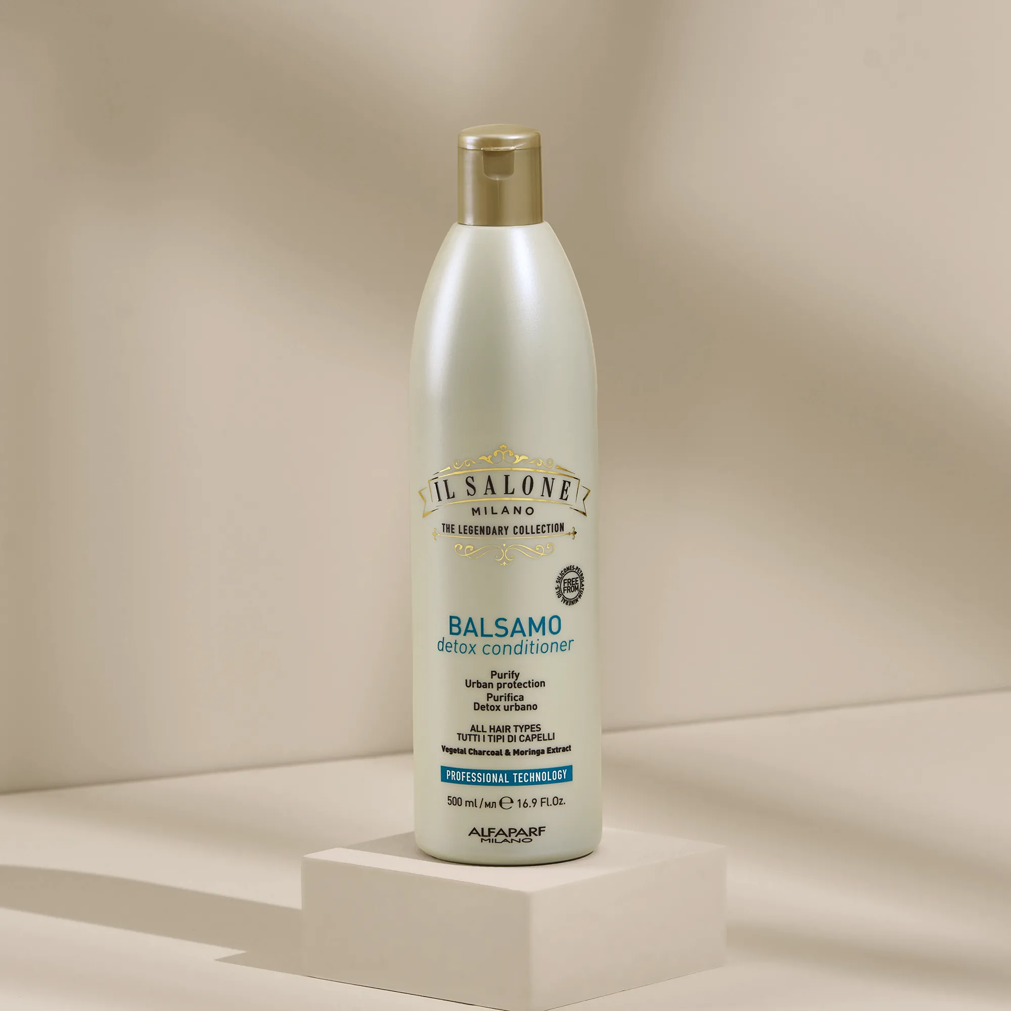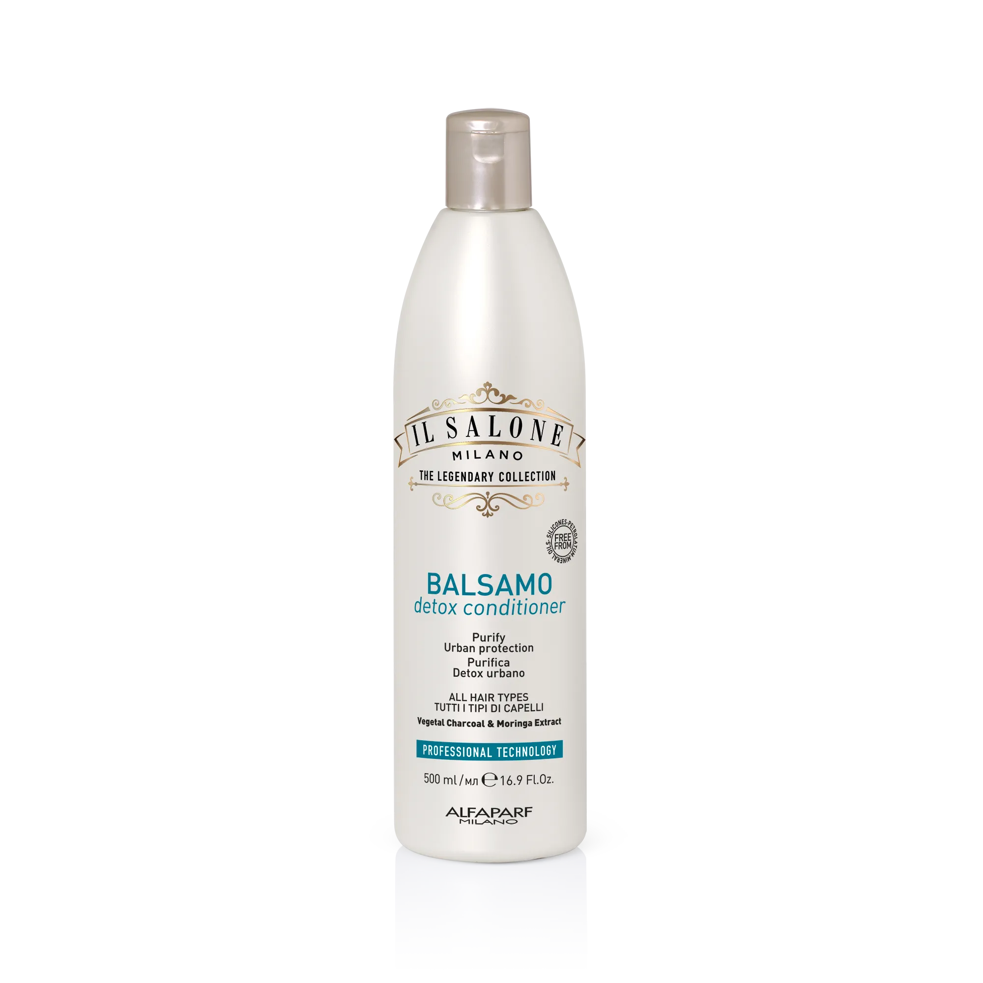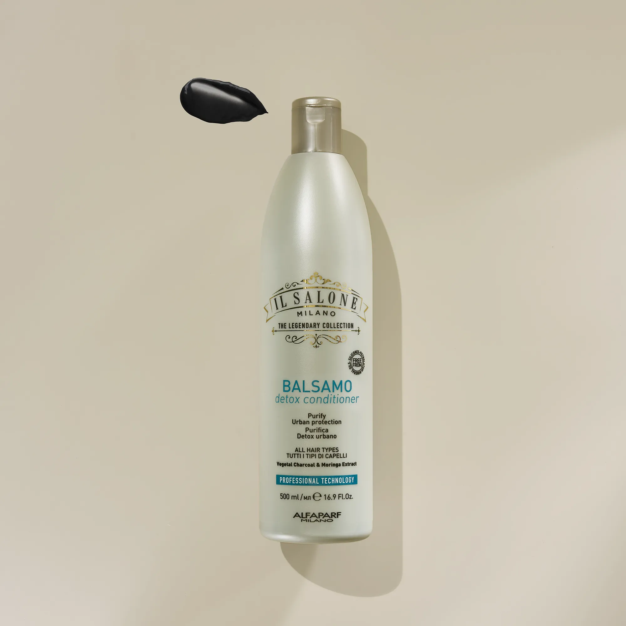 Професионален черен балсам за всички типове коса. Съставът с растителен въглен абсорбира замърсяванията, детоксикира и предпазва косата от замърсители*. Специалната смес от активни съставки възстановява естествения баланс на косата и скалпа. Използва се от фризьори.