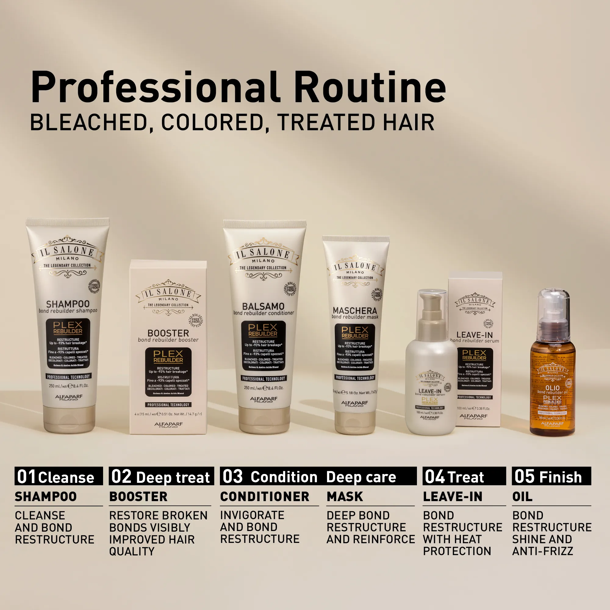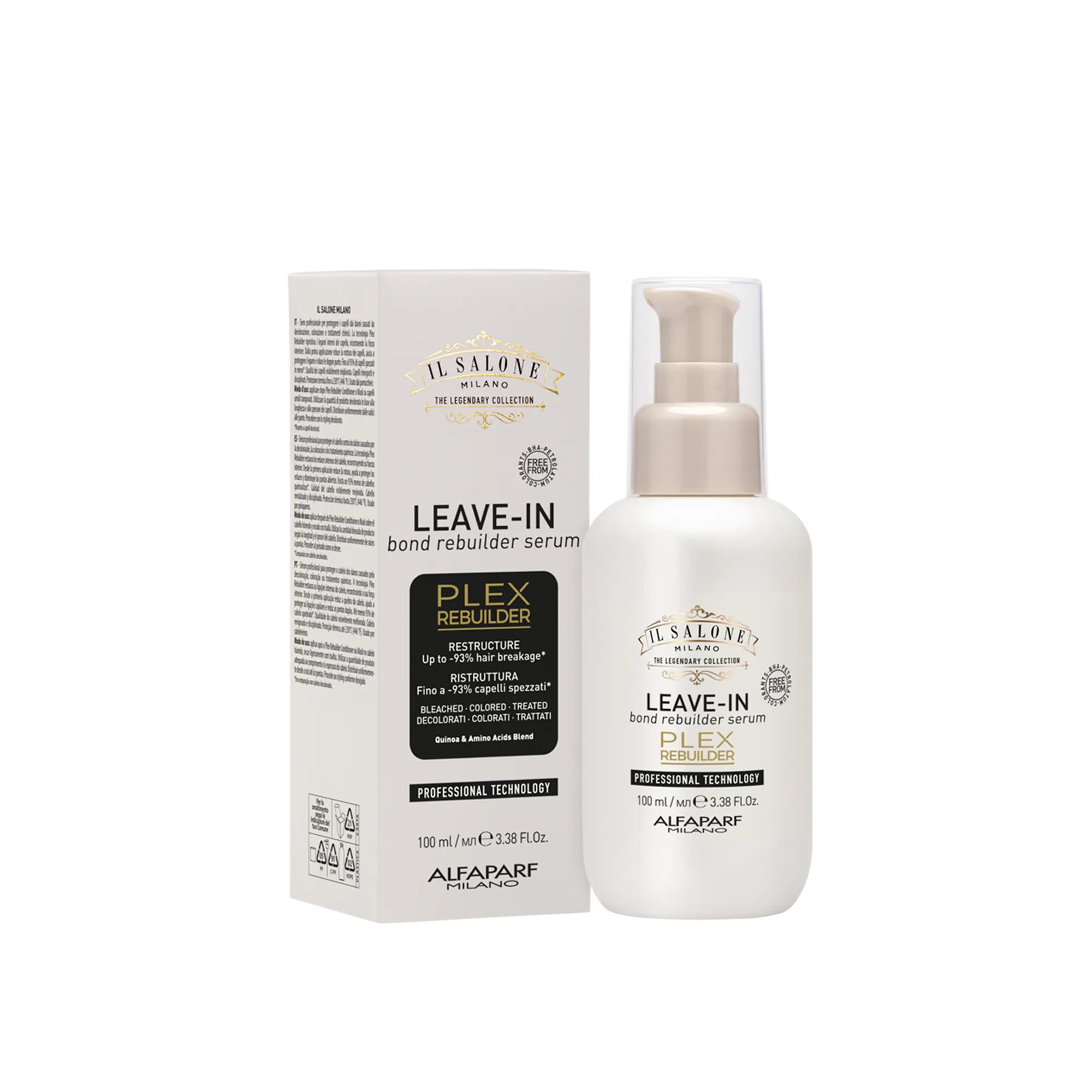 Професионален серум за защита на косата от увреждания, причинени от избелване, боядисване или химически процедури. Plex Rebuilder възстановява вътрешните връзки на косъма, като възстановява вътрешната му сила. Още от първото нанасяне намалява чупливостта на косата, спомага за защитата на връзките и намалява цъфтежа. До 93% по-малко счупена коса*. Видимо подобрено качество на косата. Оживена и подредена коса. Термична защита до 230°C (446 °F). Използва се от фризьори.